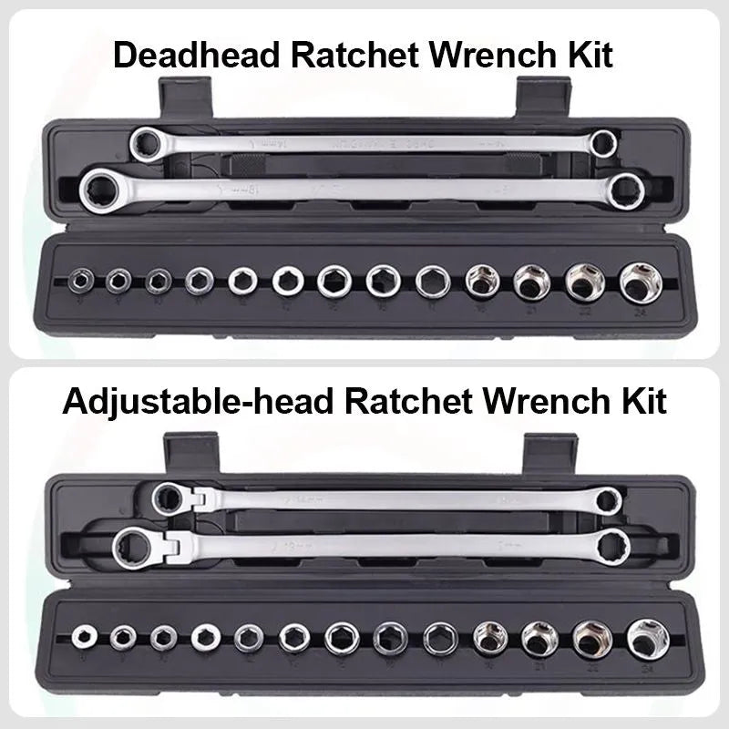 Extra Long Flex-Head Ratcheting Wrench Set includes all 9 sizes of hex heads from 8mm to 17mm and 4 sizes of sleeve heads from 18mm to 24mm.
