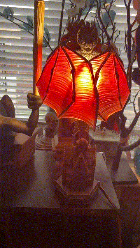 The delicate lampshade is shaped like a delicate bat, and glows with haunting beauty as light passes through its translucent wings, creating an atmosphere that is both eerie and enchanting.