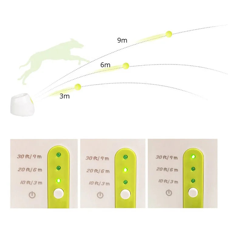 A: The Dog Pet Toys - Automatic Tennis Ball Launcher operates by allowing you to choose a launching distance (10, 20, or 30 feet) and then automatically throws a mini tennis ball at the selected distance. The launcher is triggered by a tennis ball sensor, ensuring a ball is launched every 10 seconds.