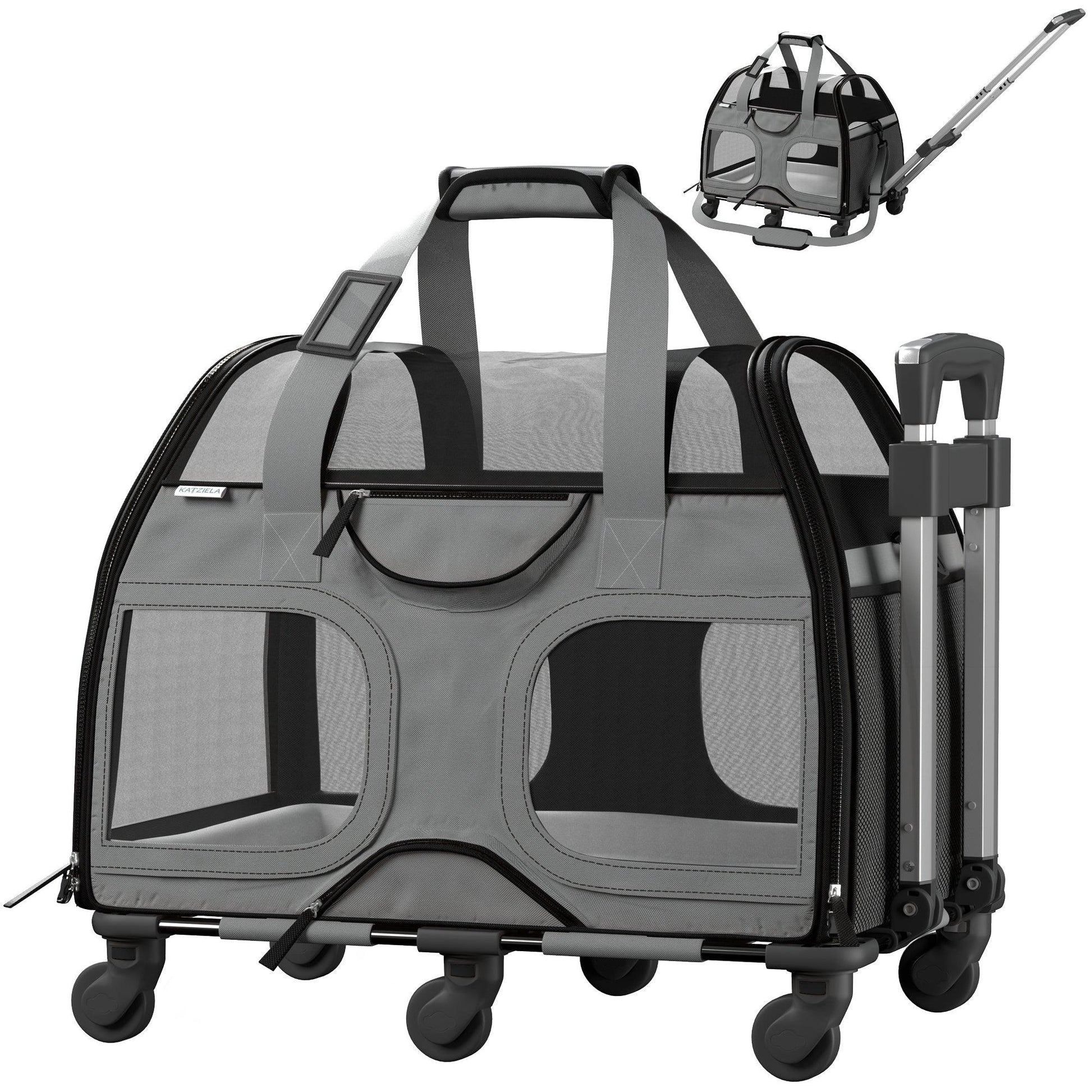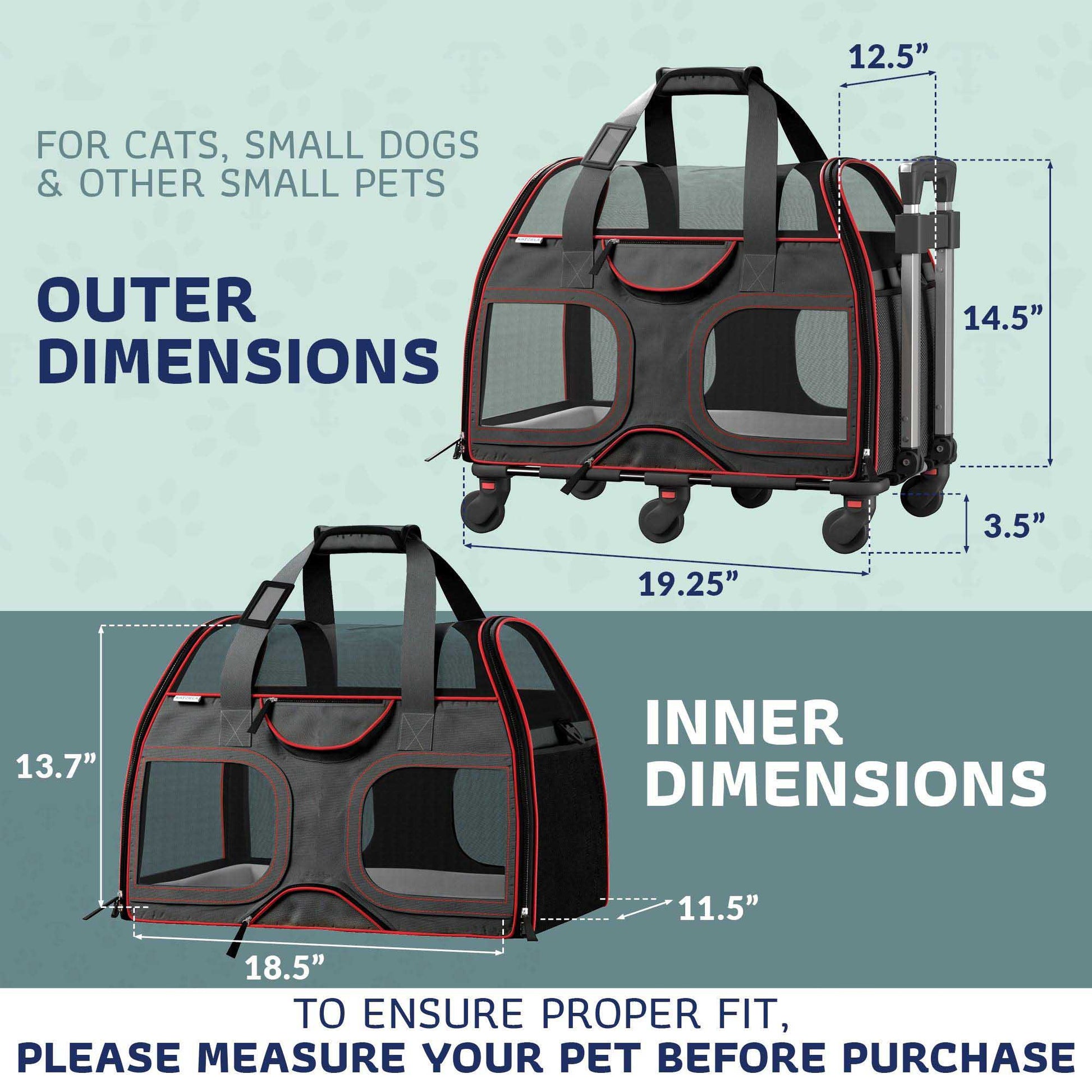 • 6 WHEEL DESIGN: Our airline-approved dog carrier and rolling cat carrier are equipped with a 6-wheel design and a double telescopic handle for effortless maneuverability. The handle remains easily accessible in an upright or 45-degree position, providing convenient control during travel.