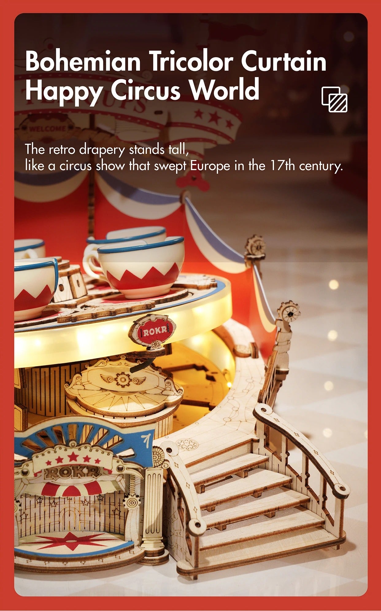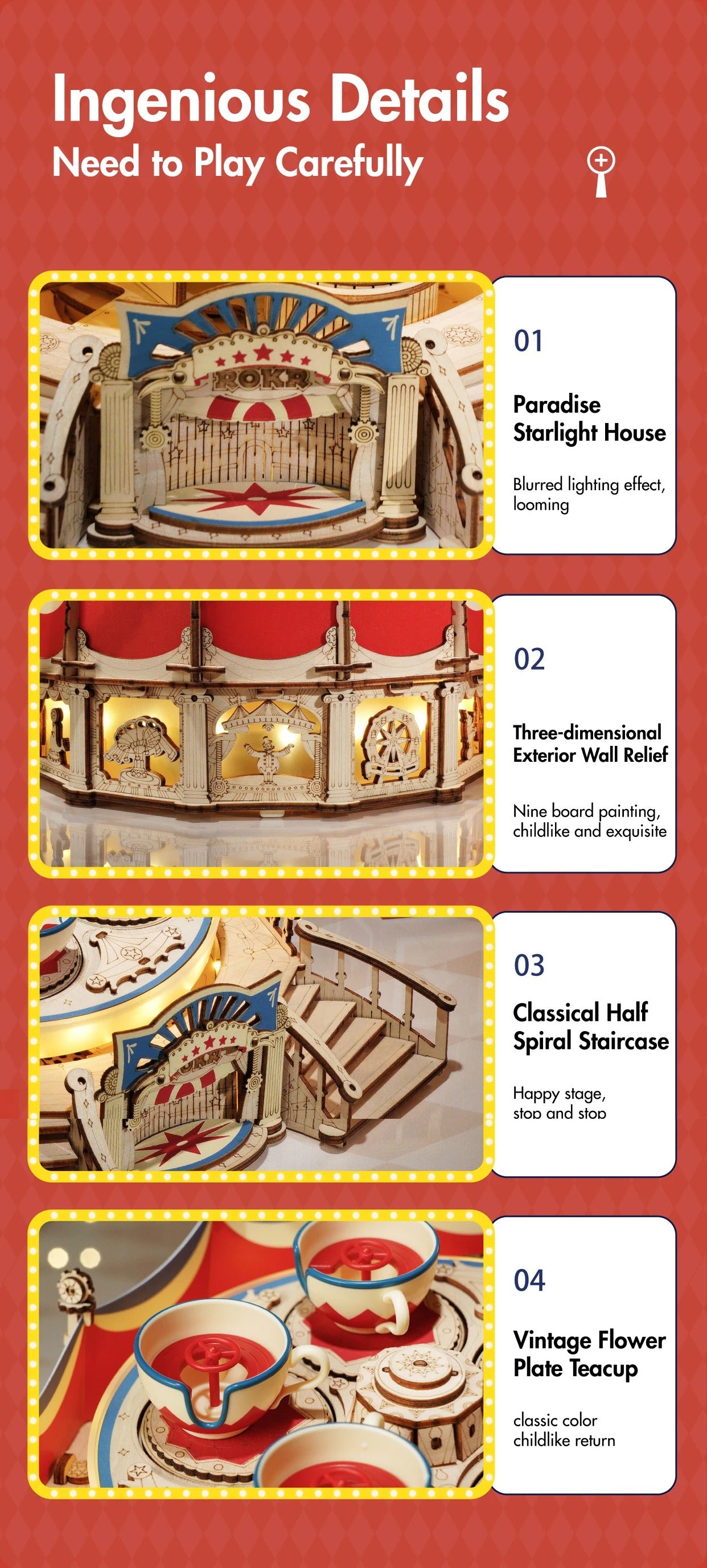 This mechanical wooden puzzle recreates a classic amusement park ride with rotating motion, integrated lighting, and music effects. The design emphasizes detailed structural elements and an engaging build experience suitable for display or interactive play.