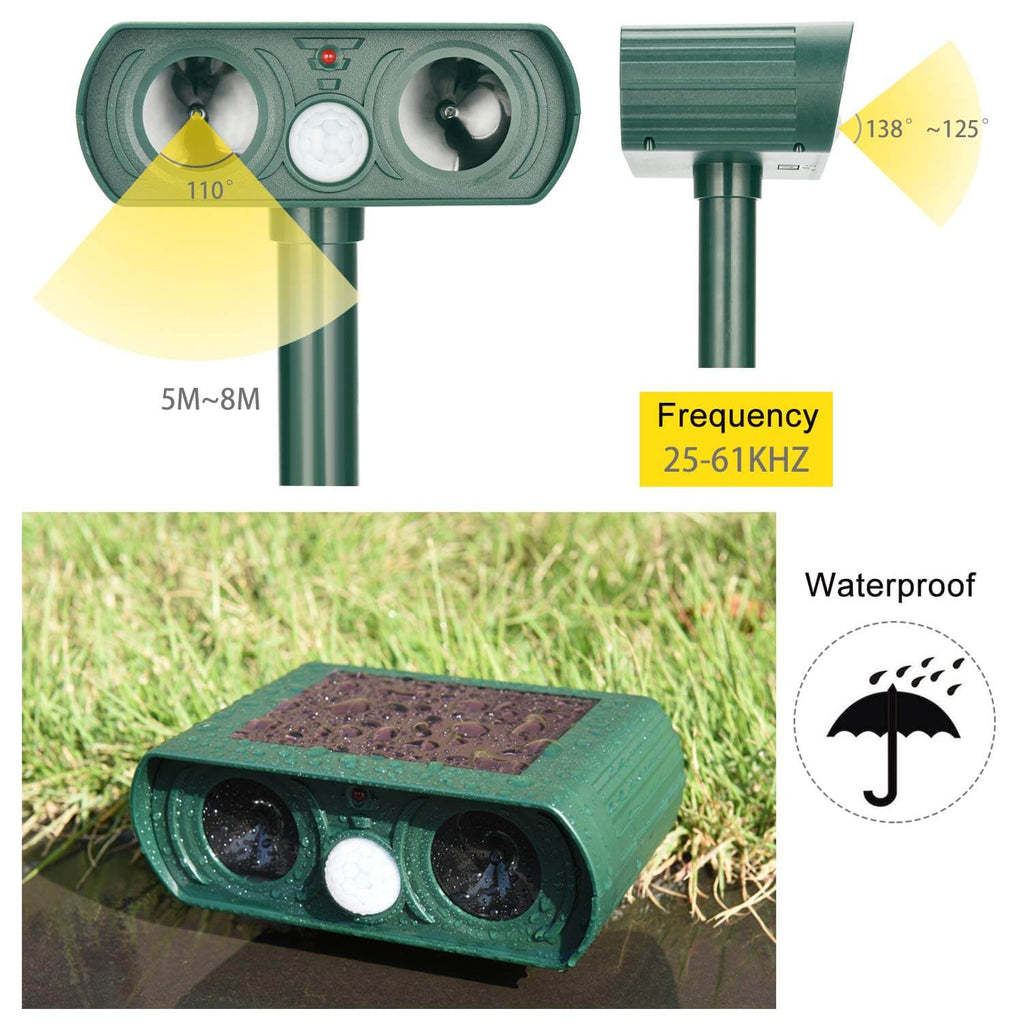 The passive infrared sensor (PIR) detects motion and triggers the ultrasonic speaker to produce a tone that human cannot hear to drive unwanted creatures away. This repeller is effective in a large area up to 2425 square feet. Since it is powered by solar . no batteries or electricity is needed. And it is perfectly suitable to use in the garden . yard . and lawn. Don??t hesitate to get one!