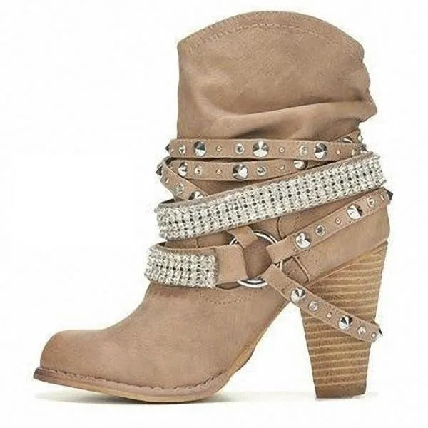 Women Fashion Short Rhinestone Booties Studded Strap Buckle Round Toe Stacked Chunky Heeled Boots