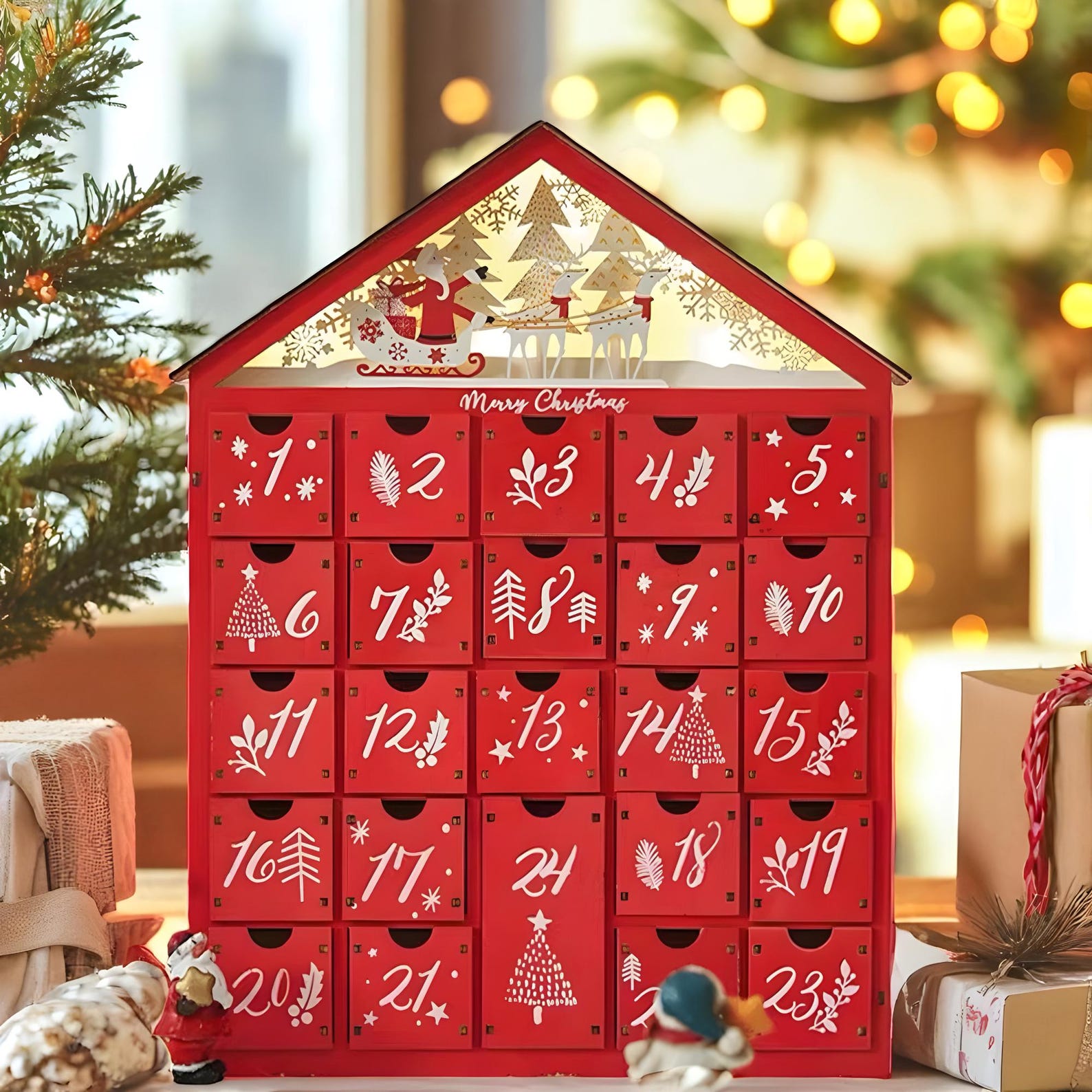 Create magical holiday memories with this enchanting wooden Advent calendar. With 24 drawers for treats and surprises, cozy LED lighting, and a festive red house design, it brings warmth, charm, and joyful anticipation to your Christmas season.